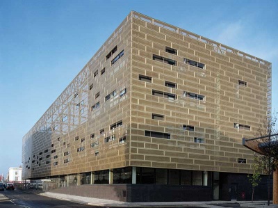 The external cladding to the Lounge building comprises a twin layered system. The internal layer is a rendered external wall insulation system on blockwork with the external layer consisting of tensioned cables supporting perforated copper sheets. The perforated cladding system is a bespoke system designed to provide a striking appearance, whilst controlling light and shading. The degree of perforation varies across the facade to create interest in the aesthetics and to control the degree of light perforation for the classrooms, sustaining a high quality of natural light without the need for additional shading.
